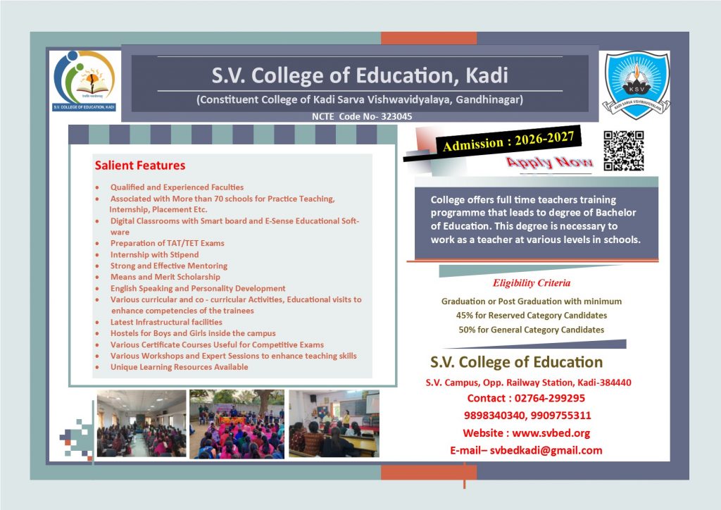 બી.એડમાં એડમિશન માટે વિદ્યાર્થીઓ અને વાલીશ્રી કોલેજની મુલાકાત લઈ શકે છે.